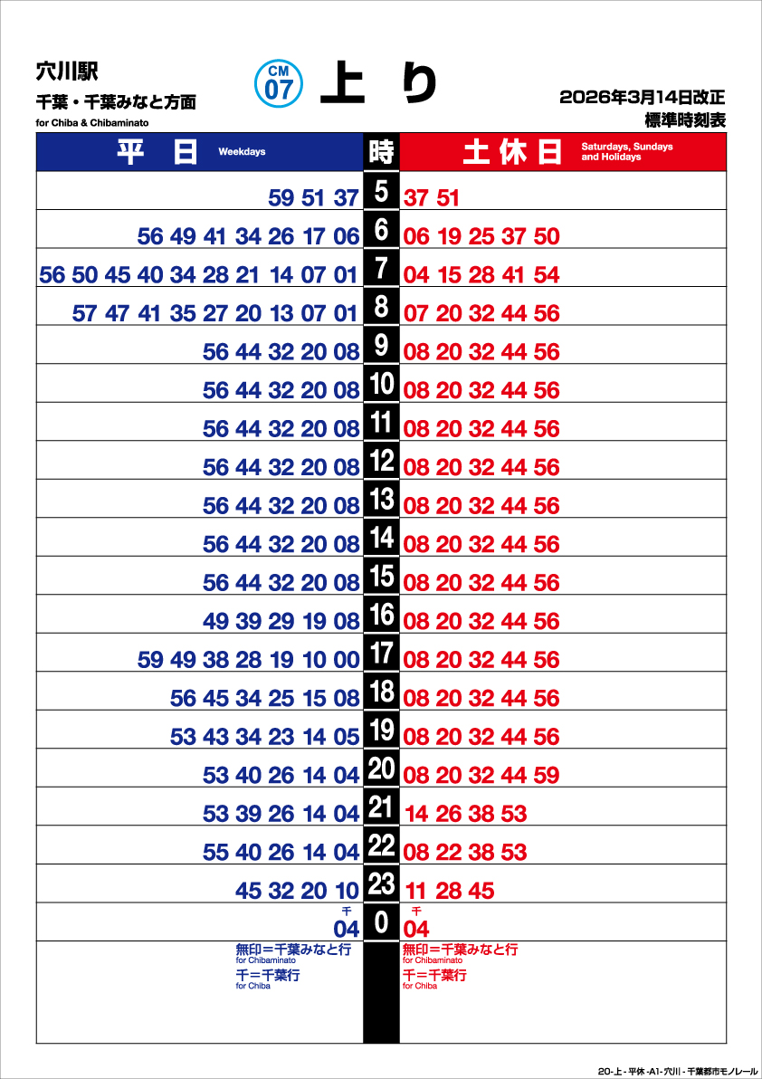 HOME > 駅情報・時刻表 > 駅情報 > 穴川 > 穴川駅 上り 202603改正時刻表