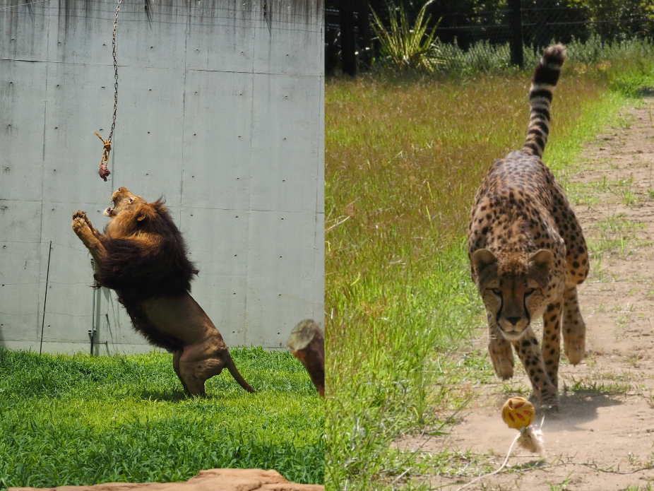 140mの周回コースを一気に駆け抜けるチーターを観察できるチーターランと、ライオンがワイヤーに吊り下げられた肉めがけて獲物を捕食するように豪快にとびかかる、ミートキャッチャーは迫力満点!
