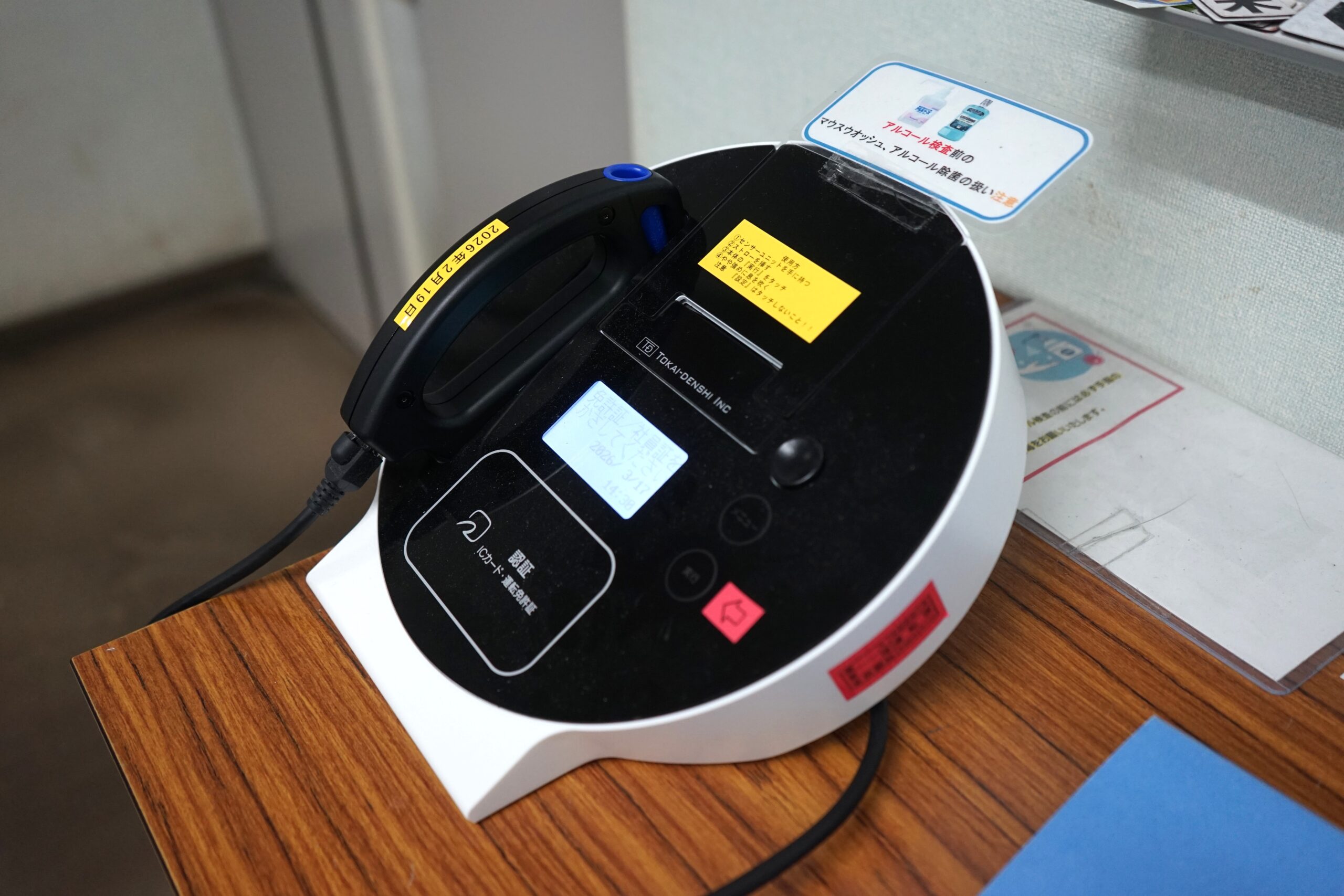 並木さんが出勤して、まず行うのがアルコール検査です。検知器に息を吹き込み、アルコールが検出されていないかを確認します。問題がなければ制服に着替え、掲示物を確認しながら運行に必要な情報をメモして、点呼へと向かいます。 -