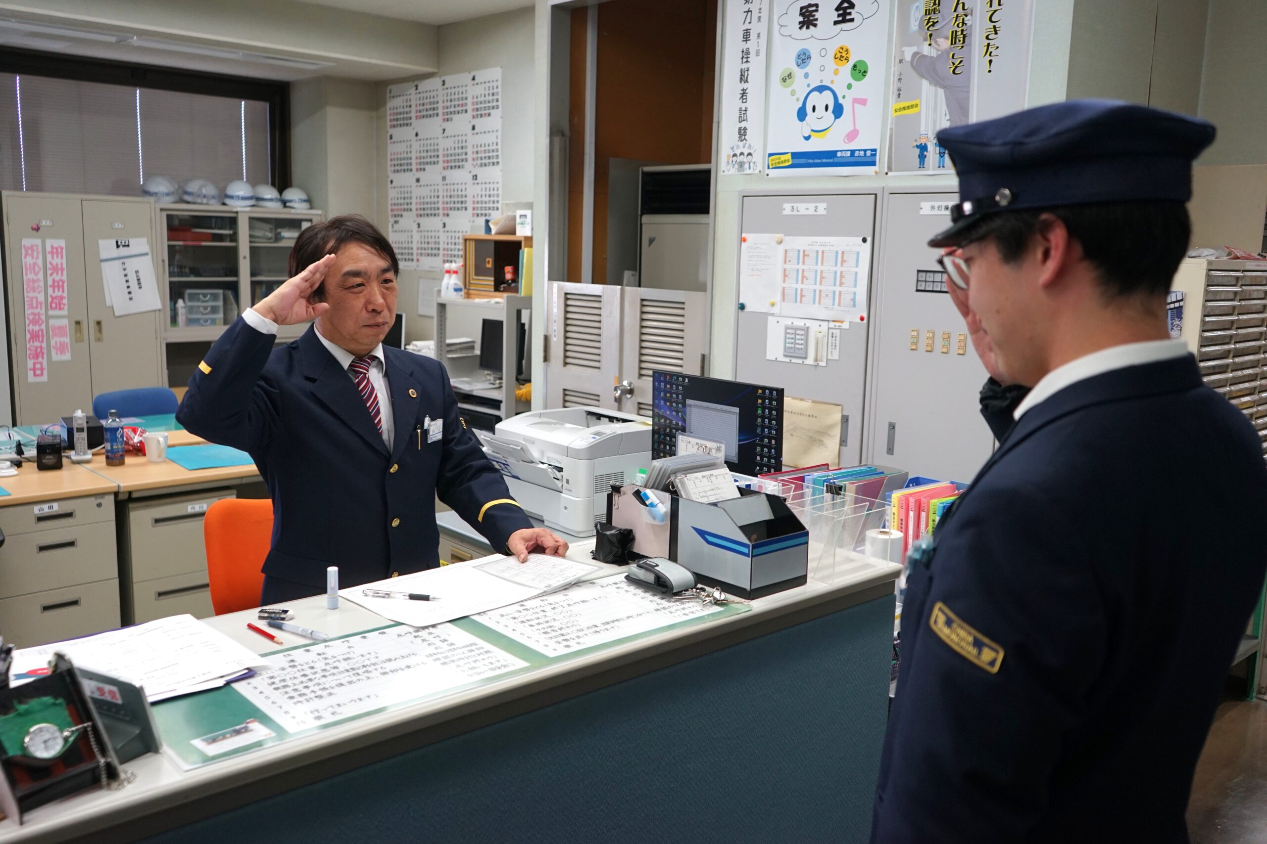 この日の乗務が終わると、交代する運転士に車両を引き継ぎます。「車両異常なし」を伝えて降車し、点呼場へ戻って終了点呼を行い、この日の勤務を終えます。