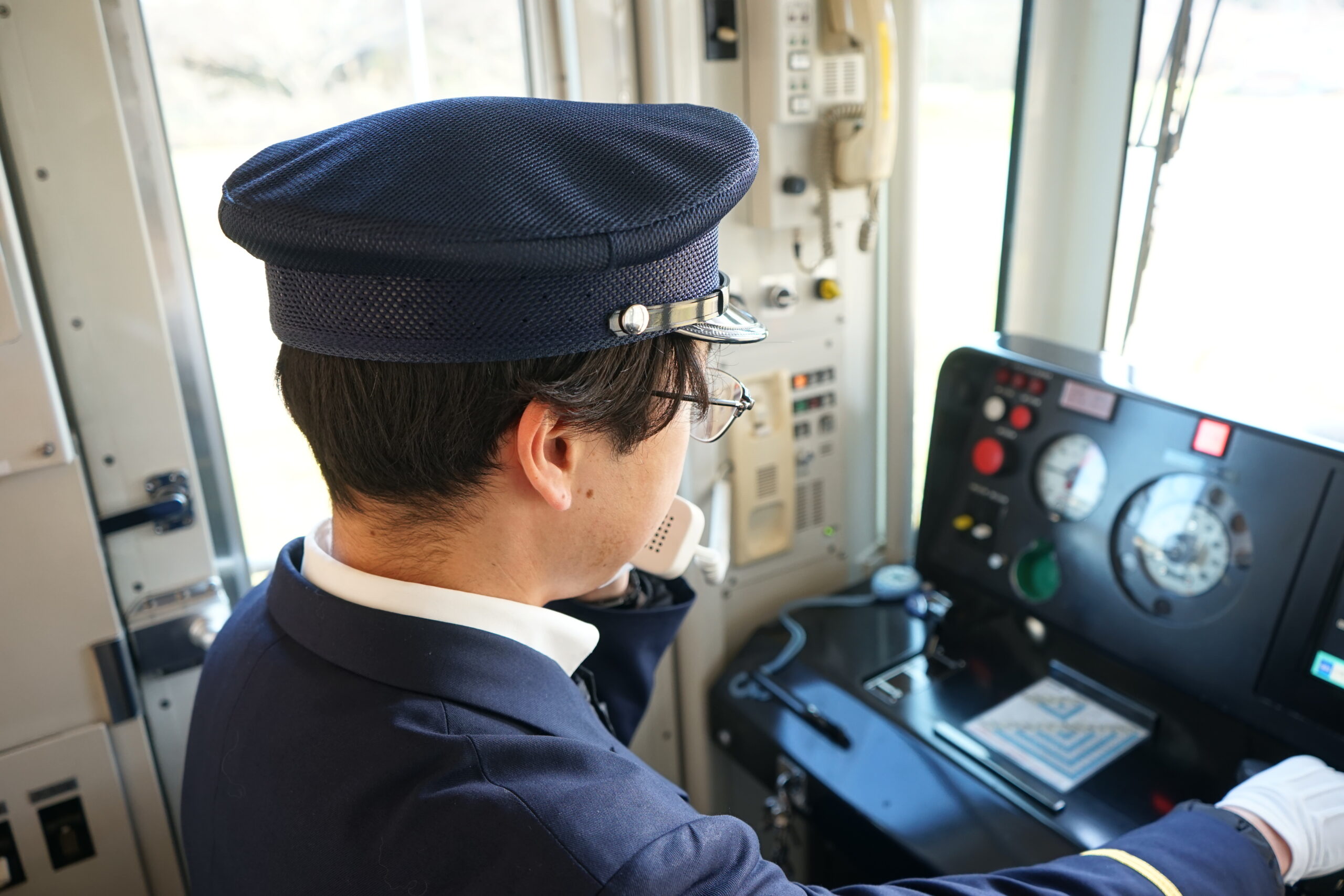 車両基地で車両に乗り込み、出発に向けた確認を行います。電源を入れ、各機器の動作状態を確認するなど、安全に運行するために必要な確認を一つずつ行い、問題がないことを確かめてから出発します。 -