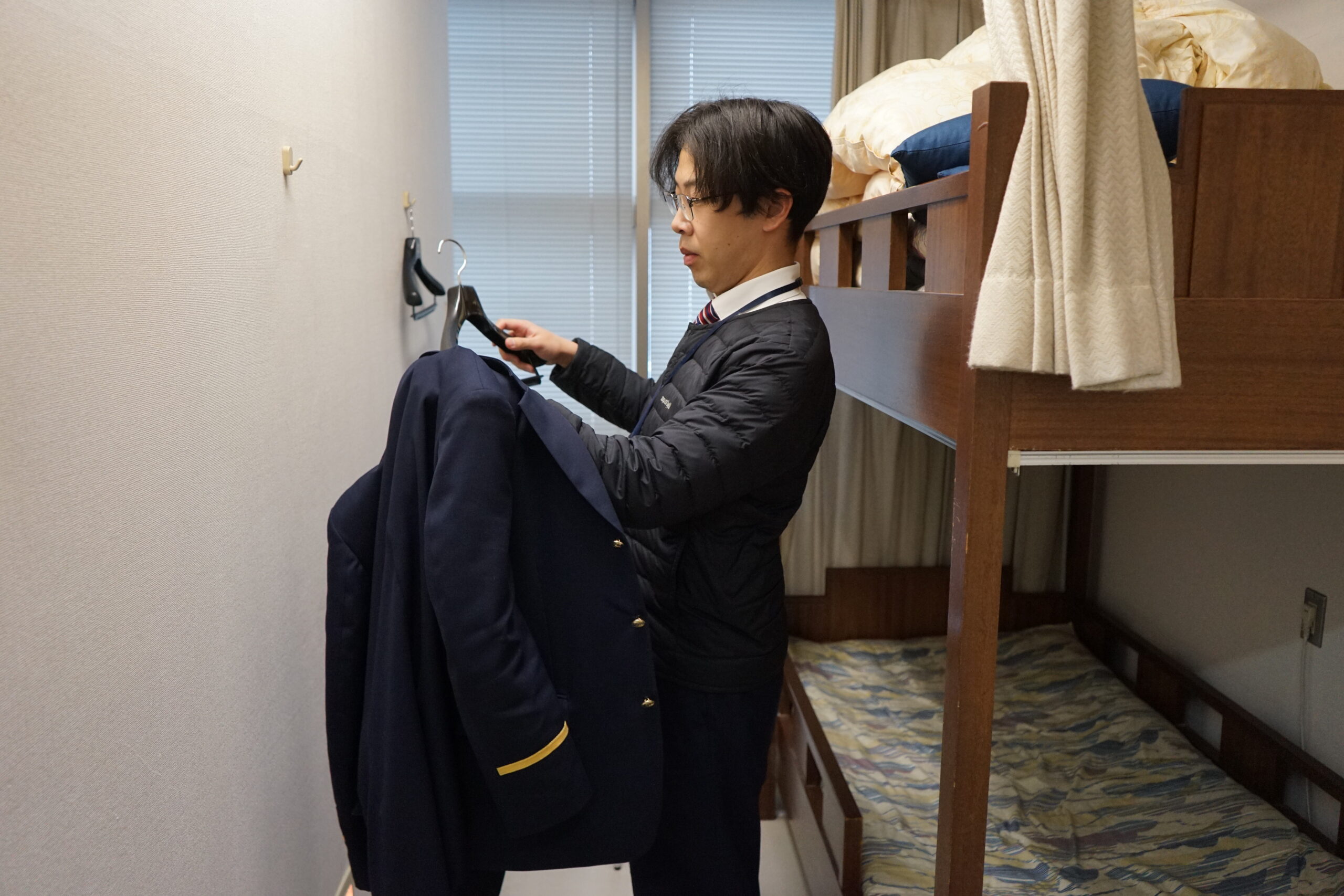 仮眠室には二段ベッドがあり、現在は一人で使用しているそうです。個室になっており、シャワー室も完備されています。1日の汗を流してから、翌朝に備えて早めに体を休めます。