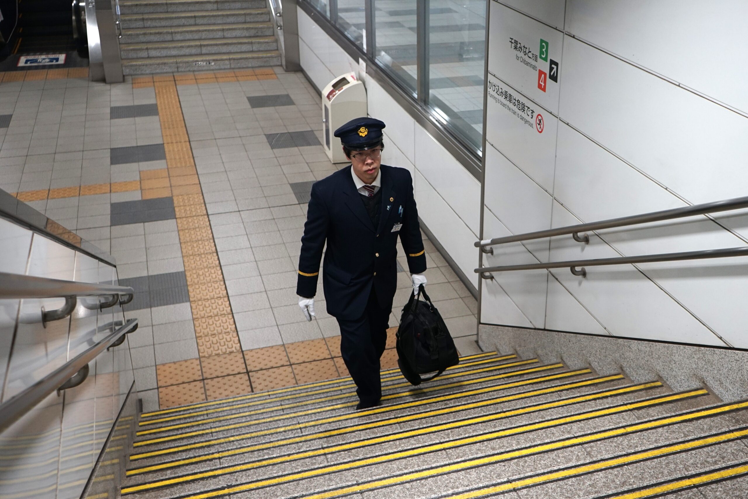 階段を上がって乗り場へ向かい、朝最初の乗務が始まります。時間が経つにつれて、駅や車内には少しずつ人が増えていきます。 -