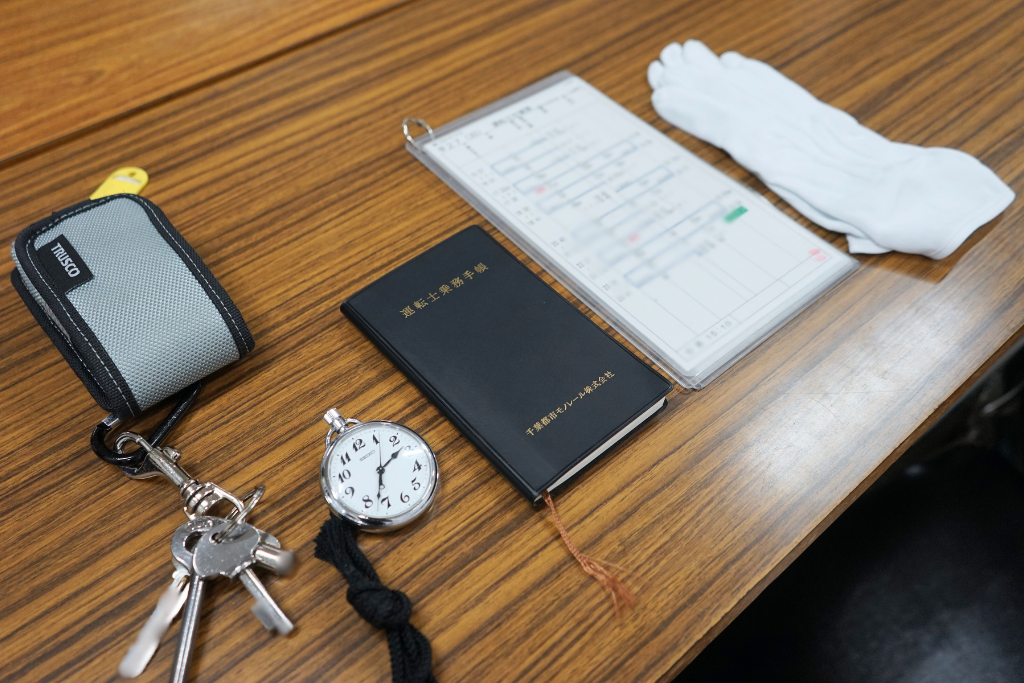 点呼が終わると、乗務に必要な携行品の確認を行います。鍵類・時計・手帳・行路表・手袋などを一つずつ確認してから出場します。