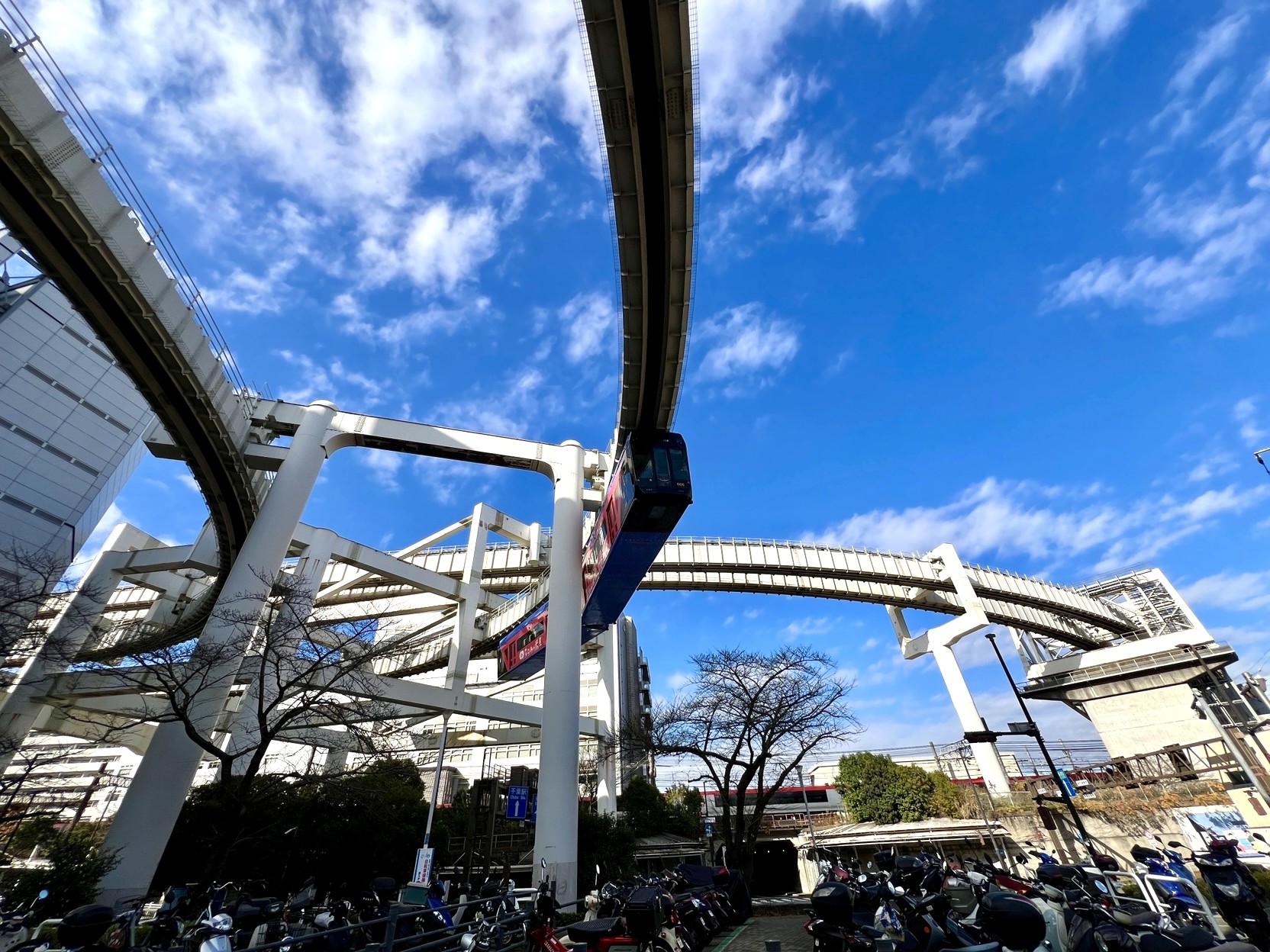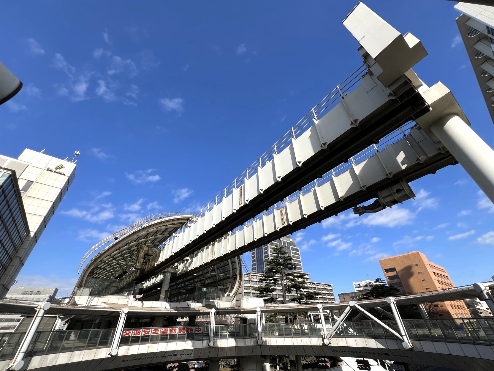 千葉市の上を走る千葉都市モノレール。港に近いエリア、市の中心部、緑の多い住宅地。進む方向によって、車窓から見える街の景色が変わっていきます。千葉都市モノレールは、千葉みなと駅から県庁前駅を結ぶ1号線と、千葉駅から千城台駅を結ぶ2号線の2路線、あわせて18駅があります。営業距離15.2kmの懸垂型モノレールで、この方式では世界最長です。