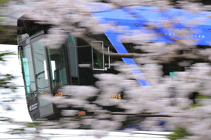 | 完成度の高い流し撮り作品に出会うことは少ないですが、『桜に包まれて』はとても見事な仕上がりです。桜の形を残しつつ、その隙間から新型車両アーバンフライヤーのロゴや車体番号、運転席をしっかり見せています。卓越した技術力とカメラ設定・シャッターチャンスの素晴らしさはグランプリに値します。 |