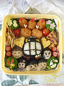 | とても可愛く、愛情たっぷり!! 中央にあるおにぎりアーバンフライヤーと笑顔一杯家族、きれいに彩られたお弁当箱から幸せをいただきました。このお弁当に相当の時間がかかったことでしょう。一生懸命作るお母さんの姿を想像しました。お弁当の出来もアイデアも素敵DE賞。